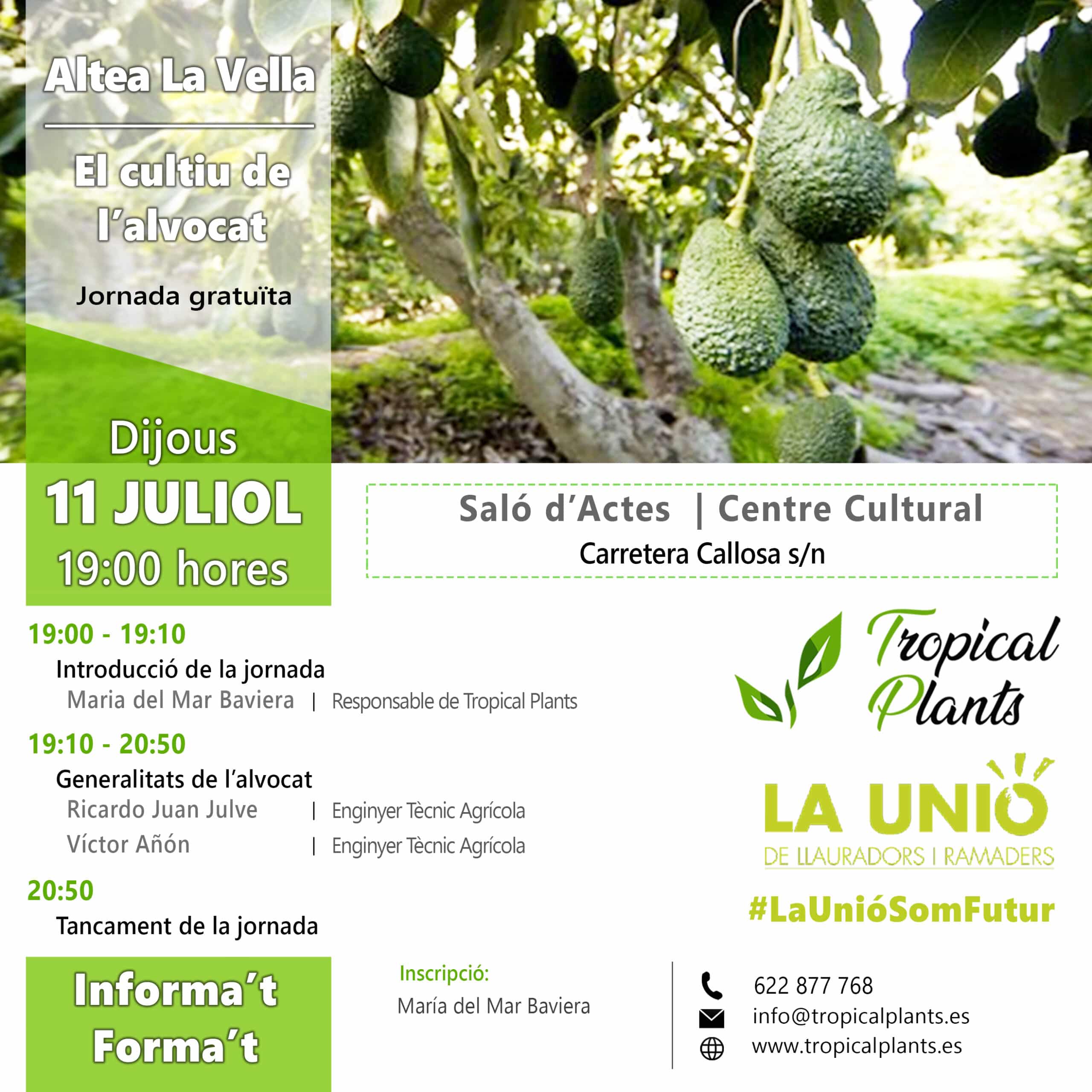 Continuando con nuestras jornadas del aguacate os invitamos a Altea el jueves 11 de julio de 2019, la Jornada será “El cultivo del aguacate”, como siempre la entrada será gratuita, simplemente debéis inscribiros en el siguiente formulario.